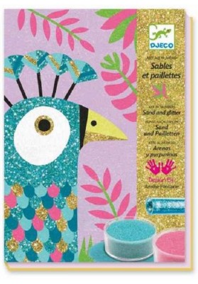 4 tableaux sur le thème des oiseaux à illuminer avec du sable coloré et des paillettes. L’enfant place son tableau dans la boîte, il dévoile les zones préencollées grâce à l’outil fourni, puis les saupoudre de sables colorés et de poudre pailletée en suivant le code couleur indiqué dans le livret. Une fois l’activité terminée, les plumages étincellent et les ramages en font autant !
