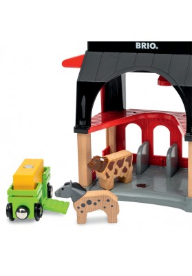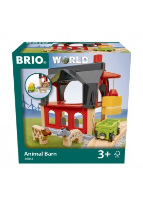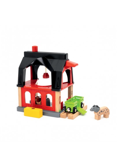 Contenu : 1 étable, 1 wagon, 1 ballot de foin, 2 animaux (1 cheval et 1 vache), 1 rail.
