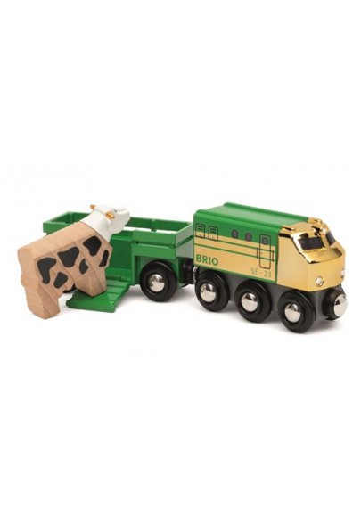 Cet ensemble est idéal pour compléter un circuit de train BRIO World. La locomotive est peinte dans une jolie couleur verte avec des fintions dorées. Il y a aussi un wagon pour animaux et une vache.