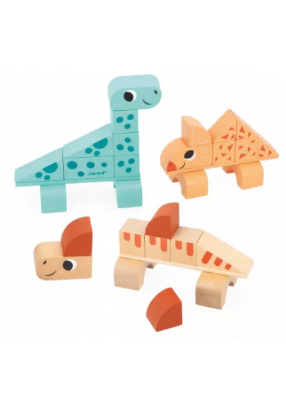 Attention, triceratops, diplodocus et spinosaure débarquent dans la chambre des enfants ! Le plus drôle c'est qu'ils peuvent être décomposés en plein de morceaux et reconstitués à l'infini ! Ce jeu en bois de 31 pièces est idéal pour les enfants dès 2 ans qui aiment construire grâce à des jeux d'assemblage ! Parfait pour développer la logique et la dextérité des enfants fans de dinos ! Ce set est composé de 3 dinosaures à assembler : un tricératops de 10 pièces, un diplodocus de 10 pièces, un spinosaure de 11 pièces. Ils sont tous les trois très mignons avec leurs grands yeux ronds et leurs couleurs aux tons verts/orangés. Pour aider les petits dans la réalisation, 3 cartes permettent de les guider pour les premières fois. Le plus drôle ? Si l'imagination des enfants est débordante, ils pourront se servir de toutes les pièces pour créer un nouvel animal, mélange de nos 3 spécimens ! Toutes les pièces sont compatibles les unes avec les autres. Ce jouet de construction est fabriqué en bois FSC®.