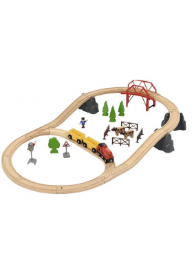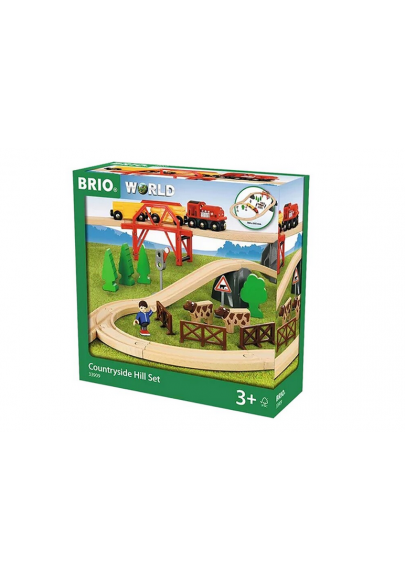 Contenu : 1 locomotive, 2 wagons, 2 vaches, 1 fermier, 4 clôtures, 1 feu de signalisation, 1 panneau de signalisation, 4 arbres, 1 pont, 3 rochers, 16 rails