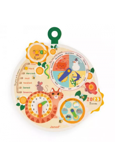 Quel jour sommes-nous ? Pourquoi dois-je porter un pull aujourd'hui ? Tant de questions pour les petits qui ont du mal à se repérer dans le temps et les saisons ! Véritable calendrier pour enfant, cette roue du temps est l'outil pédagogique idéal pour aider les bambins dès 3 ans à mieux comprendre le temps qui passe. Cet agenda en bois s'accroche aisément au mur, pour accompagner les enfants dans leurs rituels au quotidien. On commence par l'année : on fait tourner la petite roue sur la droite pour afficher le bon chiffre. Pratique, elle est double-face et permet de suivre l'enfant sur 10 années (5 ans sur chaque face) ! C'est au tour des saisons : grâce au cadran illustré, les enfants sont guidés par les illustrations et indiquent le bon mois. Ensuite, place aux jours de la semaine : on déplace le curseur de haut en bas et du lundi au dimanche, puis on fait tourner le soleil pour afficher la date du jour. Trop facile ! Place à la météo : on jette un œil par la fenêtre et on place l'aiguille sur le dessin correspondant. Idéal pour les enfants qui apprennent à s'habiller seuls ! Pour aller plus loin, on peut même indiquer l'heure sur le dos d'un adorable chat roux. Les aiguilles sont de 2 couleurs distinctes pour différencier les heures des minutes, pratique quand on commence à apprendre à lire l'heure ! Ce calendrier en bois joliment décoré avec des éléments naturels et de petits animaux se fond à merveille dans une chambre d'enfant. Il laisse apparaître du bois naturel, certifié FSC®. Petites abeilles et autres papillons accompagnent les enfants en maternelle qui peuvent reproduire les rituels en place à l'école. Cette roue du temps est aussi un jouet éducatif pour les plus grands qui apprennent à lire. Elle est disponible en français uniquement.