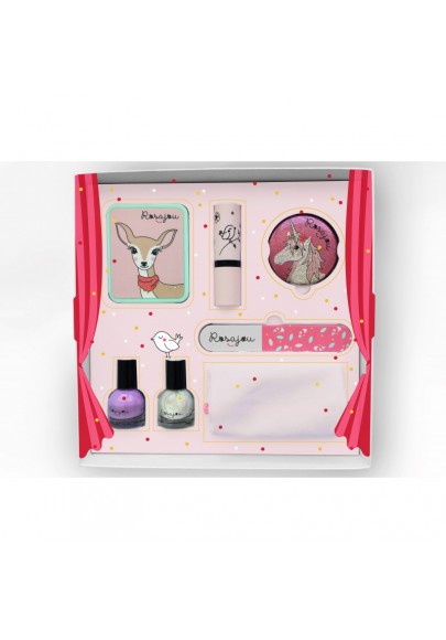 Contient : 2 vernis à ongles à l'eau : mauve LAVANDE et blanc nacré PERLE, 1 rouge à lèvres rose RUBIS, 1 fard à paupières boitier miroir, un pochon en coton licorne, un miroir de poche licorne.