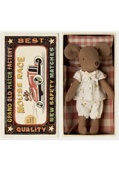 Un classique Maileg : cette souris est prête à jouer et dormir dans sa boîte d'allumettes assortie. Les vêtements et le linge de lit sont fabriqués dans des tissus doux aux imprimés uniques. Prolongez l'histoire en y ajoutant des accessoires.