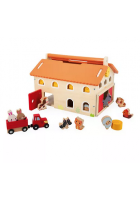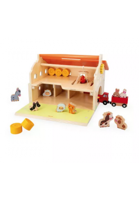 Bienvenue à la ferme ! Avec cette merveilleuse ferme en bois, les enfants passionnés par la ferme et les animaux dès 2 ans seront ravis. Robuste et parfaite pour les petits agriculteurs en herbe, la grange en bois permet aux bambins d’inventer les histoires issues du quotidien à la ferme comme les plus folles aventures : c’est un réel support à rêves ! Cette ferme réaliste est livrée avec une variété d’accessoires : 17 en tout. 10 figurines animaux de la ferme (2 lapins, 2 moutons, 1 chat, 1 chien, 2 vaches, 1 âne, 1 poule), 5 ballots de paille et 1 tracteur avec sa remorque magnétique viennent compléter la maisonnette. Pour toujours plus de jeu, la première ferme de bébé est bien équipée : les petits fermiers adoreront utiliser la poulie pour faire descendre et charger les bottes de foin, puis les apporter dans le champ avec le tracteur en bois. De plus, notre jouet ferme dispose de portes coulissantes et d'une porte à charnière à élastique. Pratique, la grange s'ouvre de deux manières différentes pour faciliter le jeu à l'intérieur : les deux pans de toit sont amovibles, et l'une des faces de la ferme s'ouvre et se referme grâce à un système magnétique super malin.
