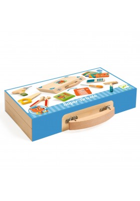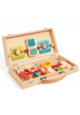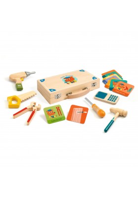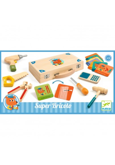 Une boîte à outils en bois incluant un marteau, une scie, un tournevis, une perceuse, une pince et huit cartes que l’on range avec soin et organisation. Les cartes associent une situation et le bon outil que doit utiliser Super Bricolo pour effectuer la réparation. Un set d’imitation riche en apprentissage.