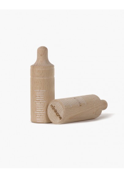 Joli petit biberon en bois de 10 x 3cm, gradué en blanc.