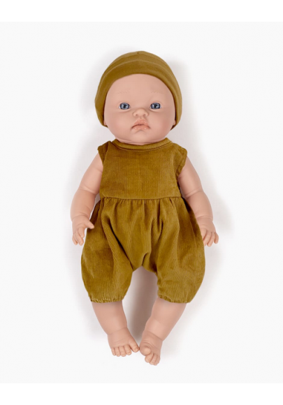 Igor, poupon asexué Minikane 36cm aux yeux bleus. Igor est habillé avec une barboteuse Noa en velours milleraies et son bonnet Tico en jersey havane.
