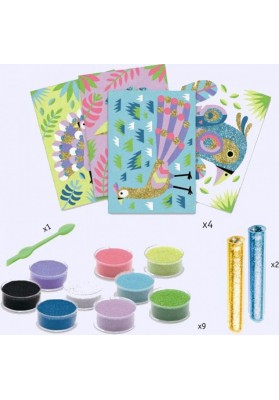 4 tableaux sur le thème des oiseaux à illuminer avec du sable coloré et des paillettes. L’enfant place son tableau dans la boîte, il dévoile les zones préencollées grâce à l’outil fourni, puis les saupoudre de sables colorés et de poudre pailletée en suivant le code couleur indiqué dans le livret. Une fois l’activité terminée, les plumages étincellent et les ramages en font autant !
