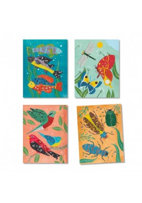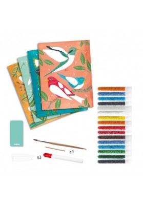 4 tableaux sur le thème des animaux à compléter avec des perles de rocaille. L’enfant dépose de la colle dans les zones à garnir, puis saupoudre et étale les perles dedans. Les illustrations brillent de mille feux !