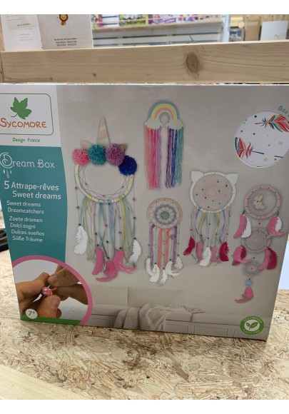 Dans cette jolie boîte cadeau, retrouve tout le nécessaire pour fabriquer 5 attrape-rêves sur le thème Sweet Dream dans les tons pastels.