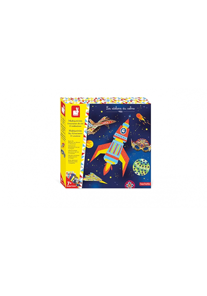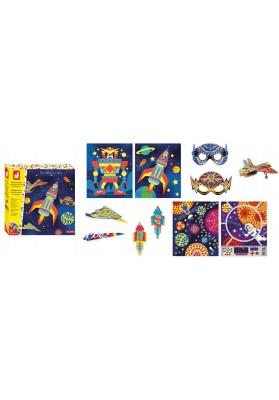 Décollage imminant ! Avec ce kit créatif multiactivités, les enfants dès 7 ans réalisent 13 créations sur le thème des aventuriers du ciel : avions, fusées, astronautes, super-héros ... Plusieurs techniques sont proposées pour des activités créatives variées ! Les plus manuels pourront réaliser 4 avions en papier, 2 fusées en papier et leur lanceur et 1 maquette d'avion. Les plus minutieux s'amuseront à décorer 2 tableaux autocollants avec des sequins, 2 tableaux avec du sable coloré et 2 masques avec des mosaïques. Un livret d'instructions est fourni, pour guider les petits créatifs pas à pas. 6 activités manuelles différentes sont proposées dans ce coffret multiactivités : pliage, collage de sequins, de mosaïques ou de sable, autocollants, maquette à assembler ... Il faudra compter 4h20min environ pour réaliser l'ensemble des créations proposées dans ce coffret. Voilà un loisir créatif riche de diverses techniques sur le thème du ciel et de l'espace ! On conserve ses jolis tableaux pour décorer sa chambre, on s'amuse à faire voler ses fusées et on se déguise avec les masques qu'on a décoré soi-même. Ce coffret créatif peut être proposé à plusieurs enfants, qui pourront prendre part à l'activité et développer leur dextérité et leur sens artistique tous ensemble. Le kit créatif multiactivités Aventuriers du ciel est issu de la collection Les Ateliers du Calme.
