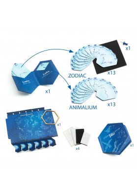 Un kit créatif pour fabriquer une visionneuse de constellations. L’enfant picote les étoiles sur les cartes pour recréer les motifs des 26 constellations sélectionnées (signes du Zodiaque et animaux), et découvre leur image à travers la visionneuse qu’il aura préalablement assemblée. L’apparition de l’illustration cachée de la constellation est absolument magique ! Un livret accompagne l’enfant pour l’aider à resituer la constellation dans le ciel étoilé. Un produit idéal pour éveiller les enfants à l’observation et à la beauté des étoiles...