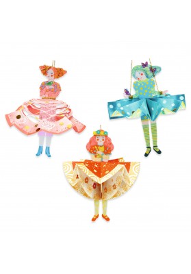 Une activité de pliage simple et astucieux pour créer 3 robes de papier et ainsi habiller les 3 fillettes d'une magnifique tenue scintillante. 3 jolies suspensions à décorer de stickers et à accrocher dans sa chambre.