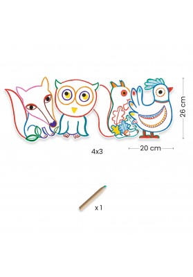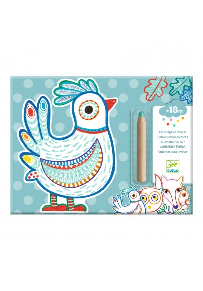 Une pochette de 12 images à colorier avec un gros crayon de couleur, adapté pour les petits enfants. L'enfant colorie les animaux de la forêt à l'aide du crayon pour découvrir ce qui se cache. C'est magique : le crayon ne marque que sur certaines zones, des motifs apparaissent et révèlent des surprises !