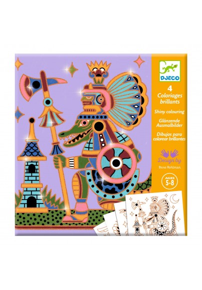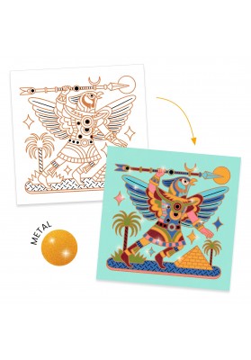Cette pochette propose une activité de coloriage pour s'évader en Égypte au temps des pharaons. L'enfant met en couleurs les 4 tableaux agrémentés d'un vernis doré. Pratiques, les cernés or en relief facilitent le coloriage : ils guident la pointe du feutre pour éviter de dépasser !