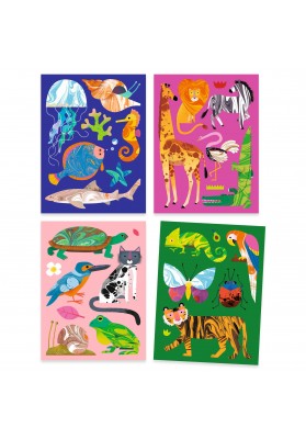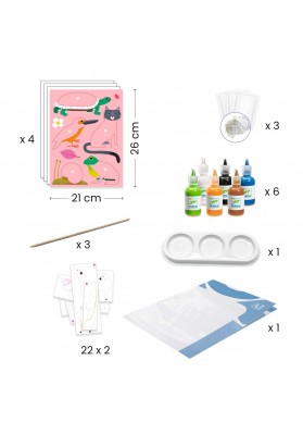 Une activité pour apprendre à marbrer le papier avec des encres colorées : l'enfant complète les animaux des 4 tableaux avec des stickers qu’il a lui-même « imprimés ». Il verse les encres goutte à goutte puis les mélange : les couleurs s'entrelacent sans se brouiller. Il dépose ensuite les autocollants à la surface du bain pour transférer les motifs sur le papier. Les motifs créés se transfèrent sur le papier comme par magie !
