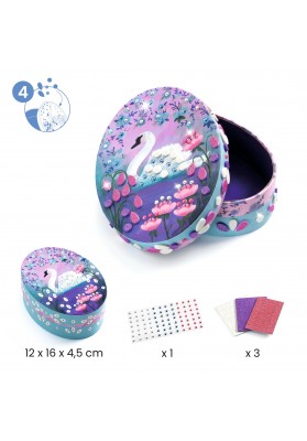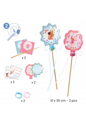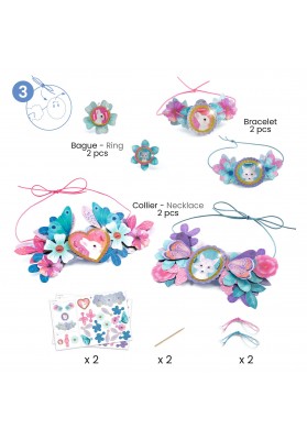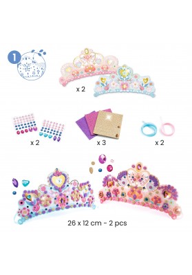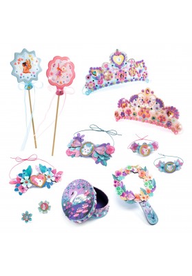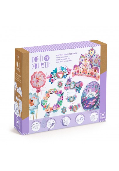Voici un coffret très complet proposant 5 activités manuelles pour réaliser 12 créations ludiques : - 2 diadèmes à décorer à l'aide de pierres précieuses autocollantes et d'autocollants en mousse pailletée, - 2 baguettes magiques à créer avec des décalcomanies, stickers et rubans, - 2 parures de bijoux à créer en enfilant les élastiques suivant la numérotation indiquée au dos des pièces, - 1 boîte à bijoux à décorer à l'aide de stickers pierres précieuses et de mousses pailletées, où ranger les 6 bijoux papier réalisés, - 1 joli miroir à enrichir, couche après couche, de décorations papier qui lui apporteront un joli volume. Des heures d’activités manuelles pour fabriquer de jolis objets et s'immerger dans la douceur des réalisations des objets créés. Tous les accessoires sont fournis pour que l'enfant réalise chacune des activités au rythme de ses envies et de sa curiosité. Des notices illustrées guident pas à pas l'enfant dans chacune des activités.