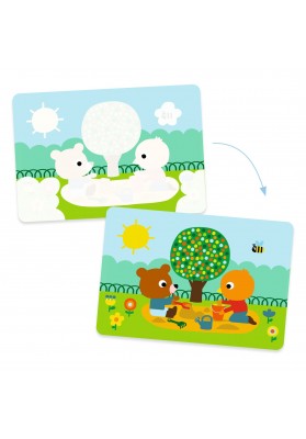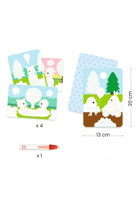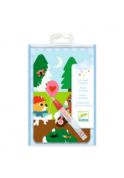 Une pochette de coloriage à l'eau adaptée pour les enfants, dès 18 mois. L'enfant colorie à l'aide du crayon à eau les parties blanches pour découvrir ce qui se cache derrière. C'est magique : des motifs apparaissent et changent de couleurs ! Les planches sèchent et l'enfant recommence !