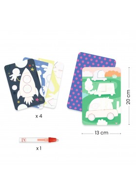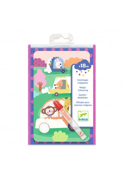 Une pochette de coloriage à l'eau adaptée pour les enfants, dès 18 mois. L'enfant colorie à l'aide du crayon à eau les parties blanches pour découvrir ce qui se cache derrière. C'est magique : des motifs apparaissent et changent de couleurs ! Les planches sèchent et l'enfant recommence !