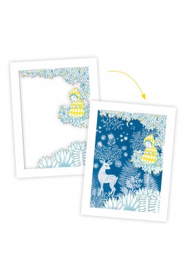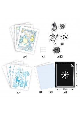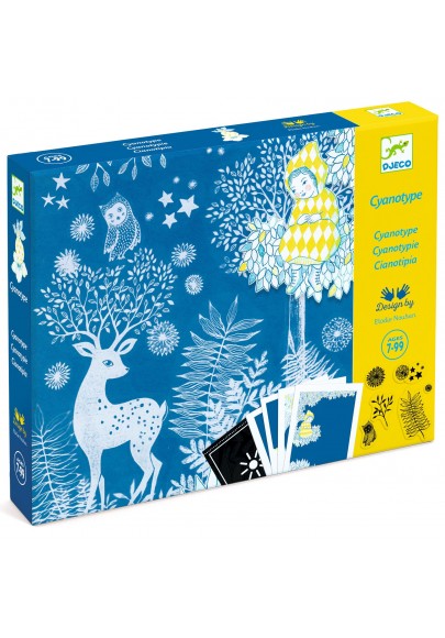 Magique, cette activité s’inspire d’un procédé emprunté à la photographie : le cyanotype. À l’aide de motifs opaques, l’enfant crée des décors sur un papier photosensible. Après une exposition au soleil, le papier est marqué des motifs en négatif. Il n’y a plus qu’à rincer le papier dans un bain d’eau claire et le décor se révèle sur fond bleu ! Ces créations deviennent les fonds nocturnes qui complètent les illustrations de 4 tableaux poétiques.