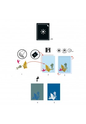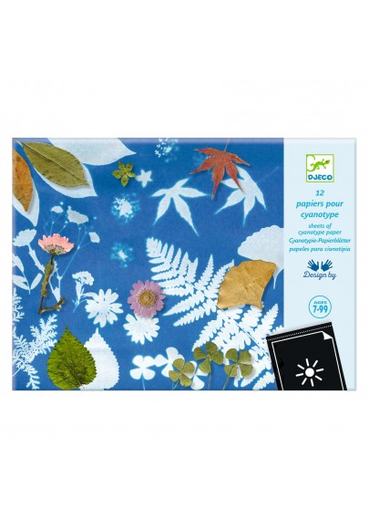 Compatible avec les coffrets de cyanotypes Djeco, ces recharges de papier photosensible peuvent s’utiliser seules avec des éléments au choix ou avec les motifs imprimés fournis. Après une exposition au soleil, le papier est marqué des motifs en négatif. Il n’y a plus qu’à rincer le papier dans un bain d’eau claire et les créations se révèlent sur fond bleu ! De quoi créer 8 compositions délicates et poétiques.