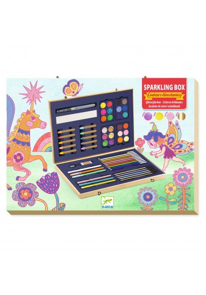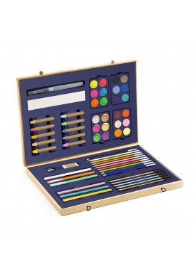 Cette riche mallette renferme un matériel de qualité et propose aux artistes en herbe de s’initier à différentes techniques. Un côté est dédié à l'aquarelle et la peinture, l'autre au dessin... Paillettes, couleurs fluo, nacrées ou métallisées permettent à l'enfant de sublimer ses créations. L’extérieur du coffret est orné d’une frise à colorier pour le personnaliser.