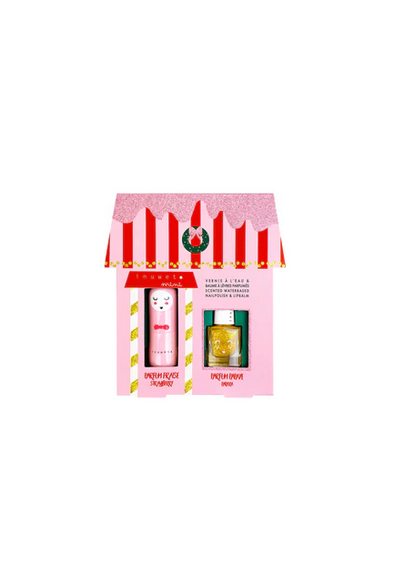 La Maison Juliette est composée d'un baume à lèvres nourrissant et parfumé à la fraise, accompagné de son vernis à l'eau pour enfant parfumé à la papaye.