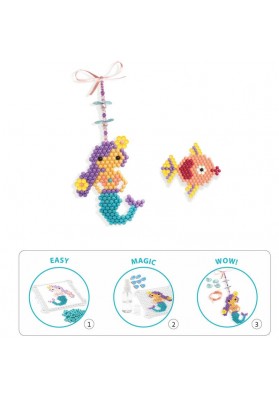 Les plus : - Magique ! Au contact de l’eau, les billes se collent les unes aux autres. - La plaque transparente laisse apparaître les modèles à reproduire. - La plaque alvéolée permet de maintenir les perles lors de la création. - De nombreux accessoires pour customiser ses suspensions. - 1 livret explicatif détaillant l’activité pas à pas.