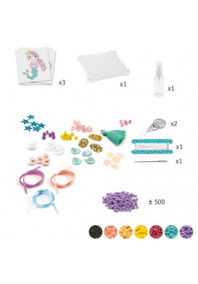 Un kit pour créer 3 suspensions « marines » avec des billes à eau. L’enfant place le modèle sous la plaque alvéolée transparente. Il positionne ensuite les billes colorées pour reproduire le dessin proposé, puis vaporise de l’eau sur sa réalisation. Une fois sèches, les billes restent collées les unes aux autres comme par magie ! Il assemble ensuite perles, ruban et breloques pour transformer ses créations en jolies suspensions.