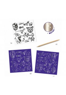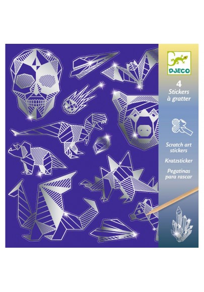 50 autocollants à gratter pour jouer avec la perspective en alternant zones pleines et hachurées. L’enfant reproduit les motifs indiqués en grattant la surface des stickers à l’aide du stylet en bois pour révéler la matière argentée. Il les utilise ensuite en déco ou pour compléter ses dessins.