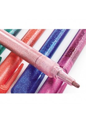 Un set de 6 marqueurs pailletés de couleur : rose, violet, bleu, rouge, vert foncé et vert clair.
