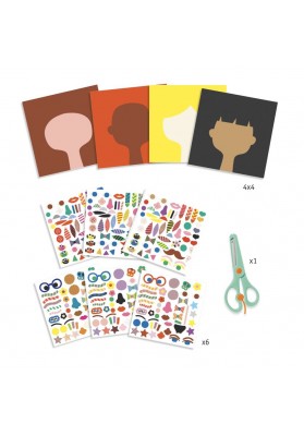 La pochette contient une paire de ciseaux, 6 planches de stickers, 4 fonds à découper (4 X 4 modèles) un livret explicatif.