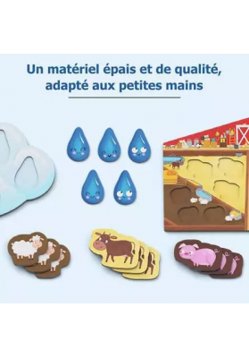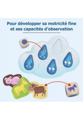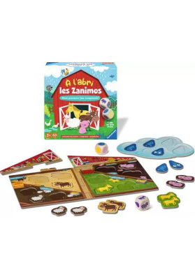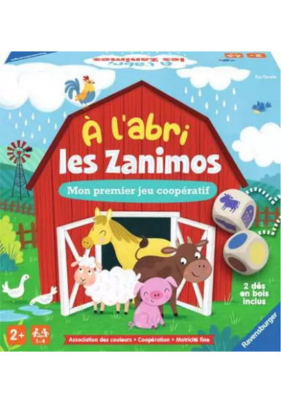 Il commence à pleuvoir... Vite ! Lance le dé et mets tous les animaux à l'abri ! À l'abri les Zanimos est un premier jeu coopératif pour les plus petits sur le thème de la ferme. Inclus 2 gros dés en bois, 12 jetons animaux et plusieurs modes de jeu. Initie les petits au jeu de société : reconnaître les couleurs, attendre son tour, faire ses premiers choix, etc. Dès 2 ans.
