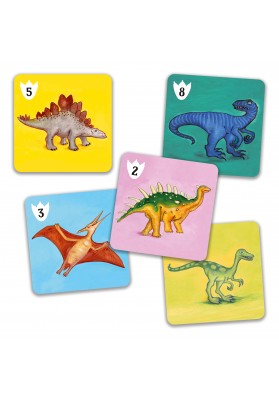 Un jeu de mémoire sous forme de bataille. Au lieu de tenir les cartes dans ses mains, celles-ci sont posées, face cachée, sur la table. Quelques secondes pour mémoriser leur place et c'est parti pour le combat de dinosaures ! 1 2 3 : chaque joueur retourne une de ses cartes et la plus forte carte remporte le pli. Les joueurs peuvent choisir la carte à utiliser et gagner le pli mais pour cela il faut se souvenir de la place de ses dinosaures ! Le joueur qui a gagné le plus de cartes remporte la partie !