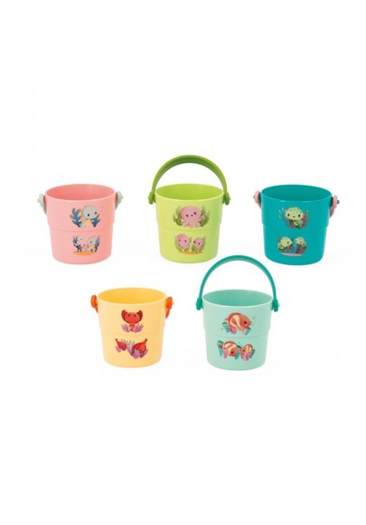 Voici un incontournable jeu de bain, les seaux percés ! Ces 5 seaux aux belles couleurs et aux jolies illustrations d'animaux marins feront bien rire bébé ! On remplit les seaux d'eau puis on s'amuse à la voir s'échapper par le dessous et à observer les seaux se vider. Les trous sous les seaux sont tous différents, les enfants pourront donc faire tout un tas d'expériences et pourquoi pas comparer les débits ! Faciles à soulever, empilables et adaptés aux mains des plus petits, ils feront le bonheur de vos petits poissons. A l'arrière des seaux, on retrouve des chiffres, permettant une activité différente dans le bain ! Ce jouet pour le bain peut être proposé aux enfants dès 10 mois.