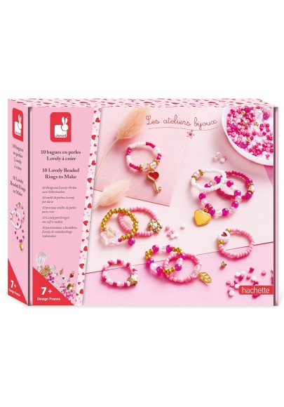 Créez d'adorables bijoux ! Avec ce kit créatif, les enfants de 7 ans et plus réalisent 10 bagues en perles dans un style adorable. Du rose, du doré, des cœurs, des étoiles … Pour un rendu vraiment romantique ! Cette activité de création de bijoux en perles est idéale pour stimuler la dextérité des enfants et leur permettre d'exprimer leur créativité. Et quel plaisir de porter fièrement ses propres bijoux faits main ! Sur tous les doigts, en accumulation ... C'est une véritable vague de glamour ! L'atout de ce coffret créatif, c'est le fil élastique : idéal pour que les bagues puissent être portées à tous les doigts et facilement enfilées ou retirées. Complet, cet atelier bijoux propose également une coupelle très pratique pour manipuler facilement les perles sans risquer de les perdre. Ce coffret de loisir créatif contient : 300 perles de rocaille, 40 perles dorées, 16 perles à facettes transparentes, 15 perles irisées roses, 6 perles intercalaires, 3 breloques, 2 perles étoiles, 1 perle imprimée cœur, du fil élastique et 1 coupelle. Pour guider les enfants dans la création de leurs charmantes bagues, un livret avec modèles et instructions et également inclus. Il faudra compter environ 10 minutes pour créer chaque bague.