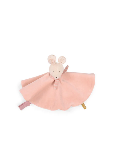 Doudou souris au doux visage brodé pour accompagner bébé. En éponge velours rose poudré et crème avec attache-tétine. Plat et rond, il est facile à saisir par les petits mains