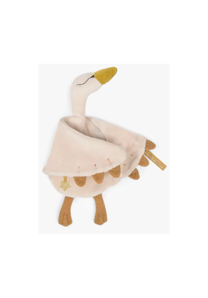 Doudou cygne au doux visage brodé et bec doré pour accompagner bébé. En éponge velours crème avec des plumes en jersey doré. Plat, il est facile à saisir par les petits mains.