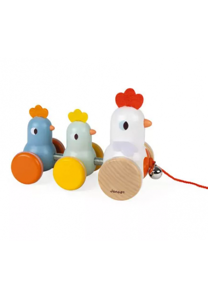 Faites place, sortie familiale en cours à la ferme ! Quelle est mignonne cette maman poule apprenant les rudiments des balades en plein air à ses petits poussins ! Ce jouet d'éveil pour les enfants à partir de 18 mois est tout mignon avec ces petits animaux en bois aux couleurs et aux formes douces et aux crêtes en feutrine. Une ficelle permet à bébé de mettre en marche la petite famille et travailler sa motricité à la maison ou en extérieur. Cette poulette fera rire bébé grâce à son déhanchement et à sa clochette qui tinte joyeusement. Des ressorts relient toute la famille les uns et autres et permet de ne pas perdre le petit dernier en cours de route ! Poule à promener certifiée FSC (bois issu de forêts gérées durablement).