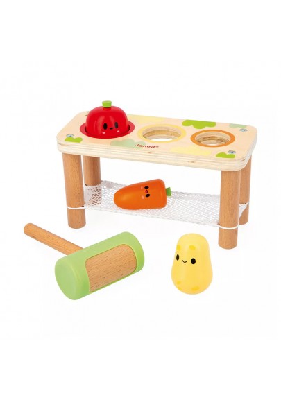 La marque Janod s'est inspirée de ce concept ludique pour imaginer Tap Tap Légumes, un jeu de manipulation en bois idéal pour développer la motricité fine dès 12 mois ! Sur une petite table de 20 x 8 cm, 3 adorables légumes bien mûrs (tomate, pomme de terre et carotte) en castrés dans des cercles.