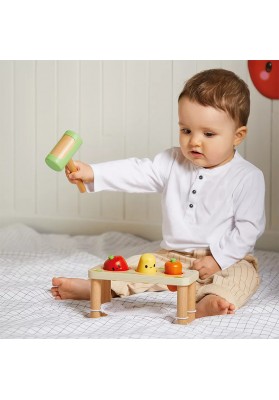Le but : taper dessus avec le marteau pour les faire tomber et les récolter dans le filet du dessous ! Malin, le bout du marteau est doté d'un revêtement en silicone pour limiter le bruit lorsque bébé tape.