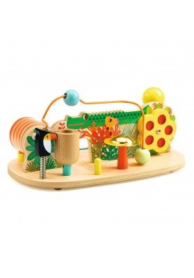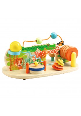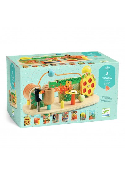 Multi Sound est une table de 8 activités sonores. L'enfant tourne autour pour jouer et découvrir comment faire les 8 différents sons : toc toc fait le perroquet à ressort sur un cylindre en bois, clac clac fait la roue qui tourne, tac a tac a tac… fait la bille le long du dos du crocodile, dling dling fait le bruit métallisé du cylindre qui tourne, cling fait la bille en fin de course quand elle tombe sur la cymbale, pong fait la bille sur l'élastique quand elle touche le tambourin, ting ting ting fait la grosse boule en dévalant le toboggan métallique, tic i tic font les disques en s'entrechoquant.