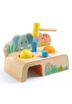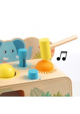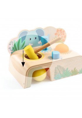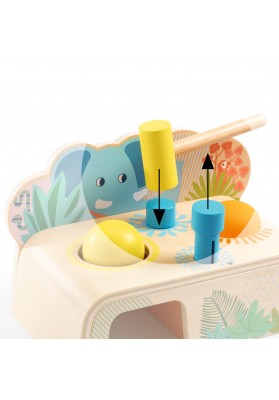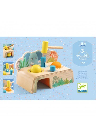 Multi Tap est un jouet en bois qui permet à l'enfant de découvrir 3 manières différentes de taper avec un marteau. Il tape sur la boule, qui ressort par la porte. Il tape sur un cylindre bleu, ce qui fait ressortir l'autre. Et il tape sur le champignon, qui fait un bruit de pouet.
