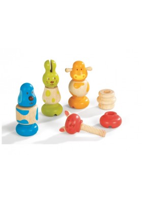 Un jeu d’assemblage pour composer 4 animaux en bois (canard, vache, lapin et chat) ! L’enfant choisit une vis en forme de tête d’animal et cherche le corps et la base à visser de la même couleur. Il assemble les pièces en les vissant, puis joue avec les animaux.
