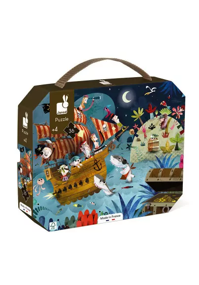 Ambiance nocturne et mystérieuse pour ce puzzle mettant en scène des pirates en quête d'or et d'argent ! Mais la tâche est rude et le chemin jusqu'au coffre semé d'embûches ! Les petits vont adorer ces illustrations et se mettre avec envie aux puzzles. Celui-ci est adapté aux enfants de 4 à 7 ans. Il contient un poster pour aider l'enfant. Fabriqué en France.