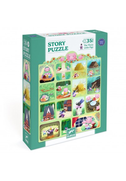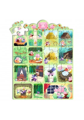 L’enfant reconstitue un puzzle pour découvrir le célèbre conte des Trois Petits Cochons sous forme d’une BD muette. Ce magnifique puzzle de 35 pièces est présenté dans une jolie boîte.