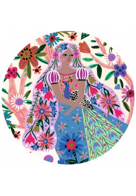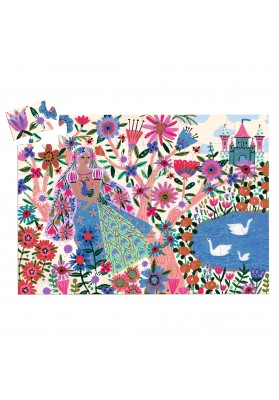 La jolie princesse se repose au bord de l'eau en compagnie de son paon coloré. Un magnifique puzzle de 36 pièces dans une boîte élégante en forme de princesse.