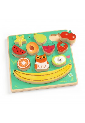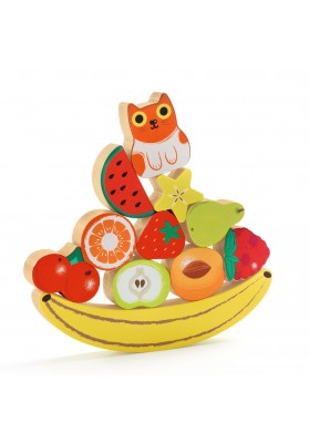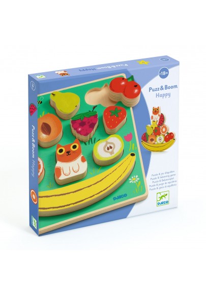 Puzz & Boom est un puzzle en bois facile à assembler et un jeu d'équilibre. Les fruits et le chat en relief tiennent debout et peuvent se poser en équilibre les uns sur les autres pour former une pyramide sur le socle « banane ».