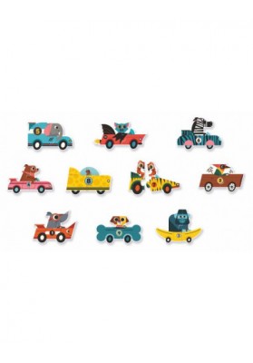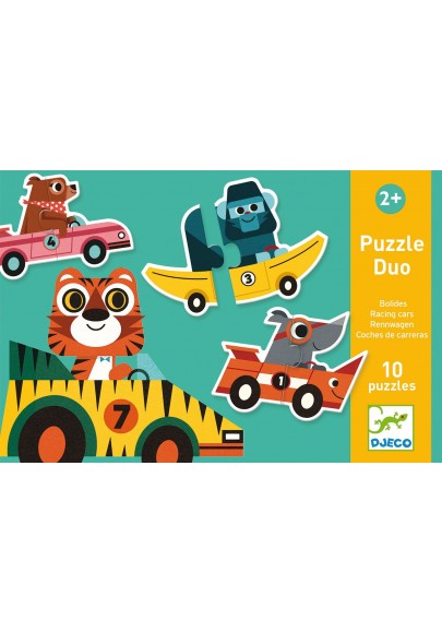 Dans Puzzle Duo Bolides votre enfant devra associer deux pièces de puzzle afin de réaliser 10 puzzles de 2 pièces de véhicules et d'animaux : un gorille dans une voiture banane, un chien dans une voiture os, un pic-vert dans une voiture tronc... un puzzle drôle et amusant ! Chaque véhicule est également numéroté de 1 à 10, une manière ludique d'appréhender également la notion des chiffres.
